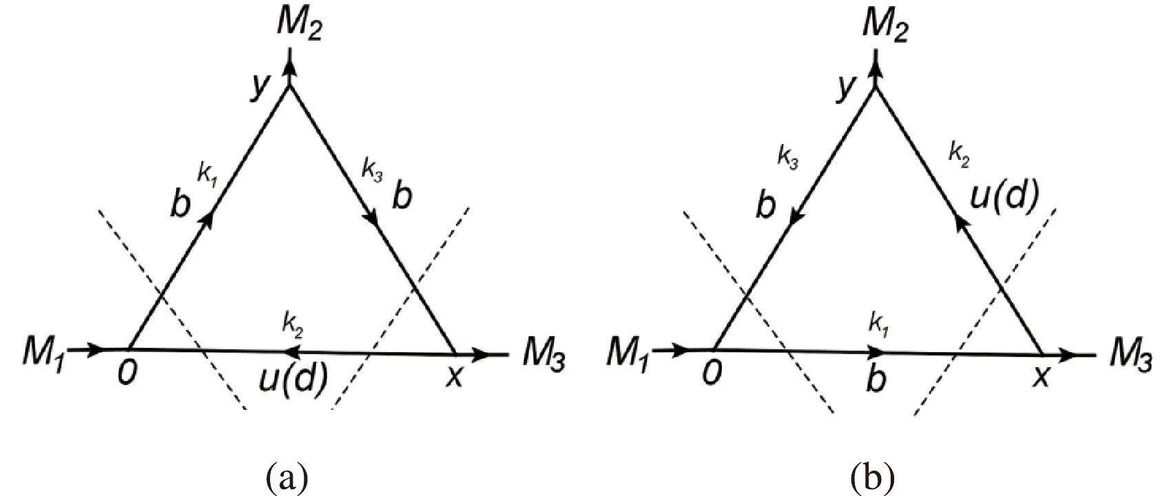 $ M_{1} $ ,$ M_{2} $ , and$ M_{3} $ denote the mesons in each vertex. Here,$ M_{2} $ represents the intermediate meson, which is off-shell. The assignments of the mesons for each vertex are listed in Table 1.Vertices M1 M2 (off-shell) M3 $ BB\Upsilon $