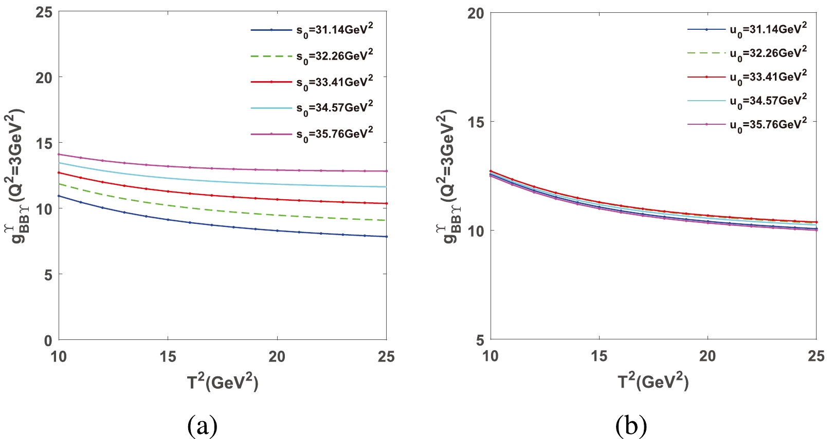$ g_{BB\Upsilon}^{\Upsilon} $ for the Borel parameter$ T^{2} $ at different values of$ s_{0} $ (a) and$ u_{0} $ (b).