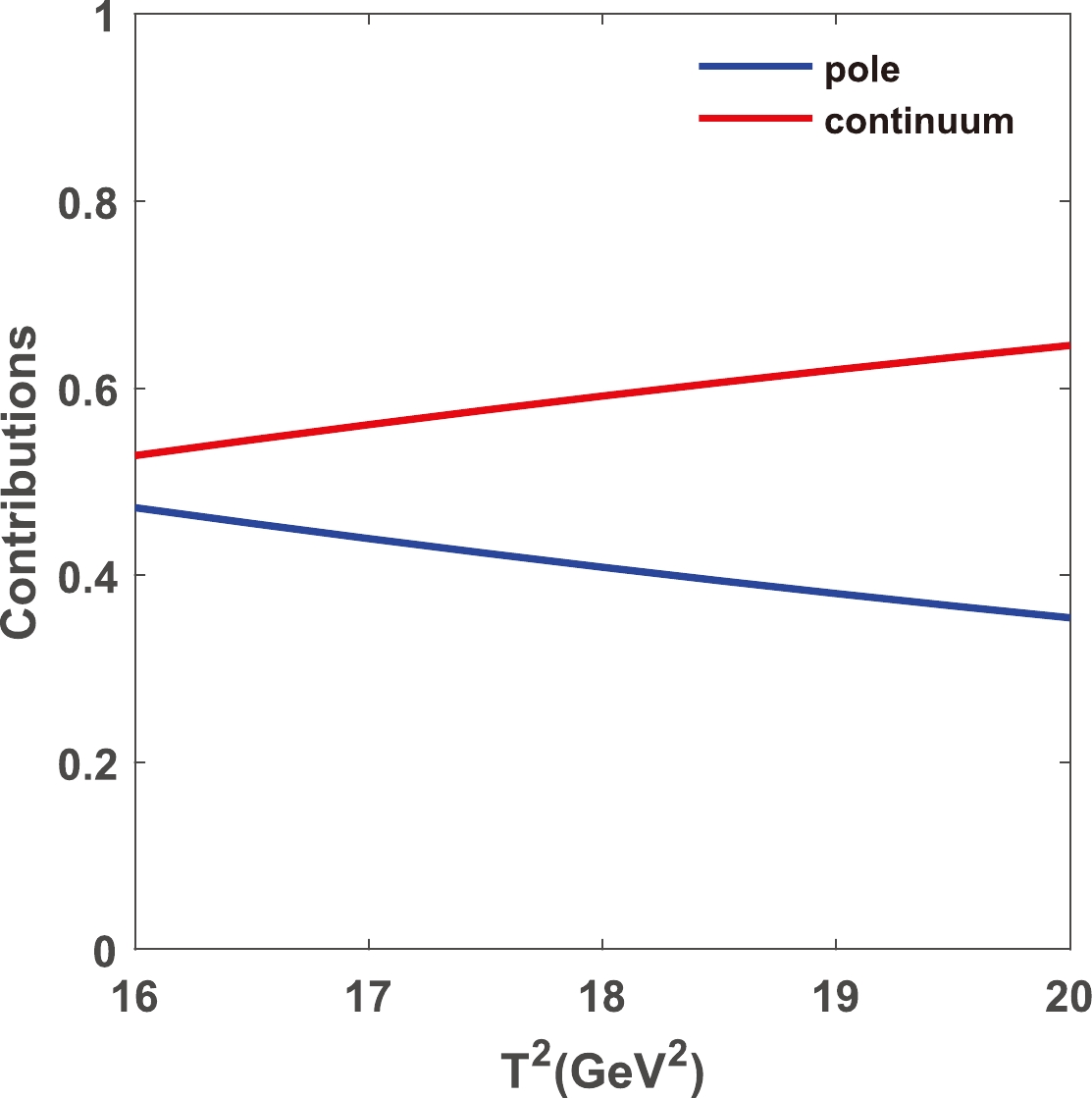 $ \begin{aligned}[b] \mathrm{Pole}=&\frac{\Pi^{\mathrm{OPE}}_{\mathrm{pole}}(T^{2})}{\Pi^{\mathrm{OPE}}_{\mathrm{pole}}(T^{2})+\Pi^{\mathrm{OPE}}_{\mathrm{cont}}(T^{2})} \\ \mathrm{Continuum}=&\frac{\Pi^{\mathrm{OPE}}_{\mathrm{cont}}(T^{2})}{\Pi^{\mathrm{OPE}}_{\mathrm{pole}}(T^{2})+\Pi^{\mathrm{OPE}}_{\mathrm{cont}}(T^{2})}. \end{aligned} $
