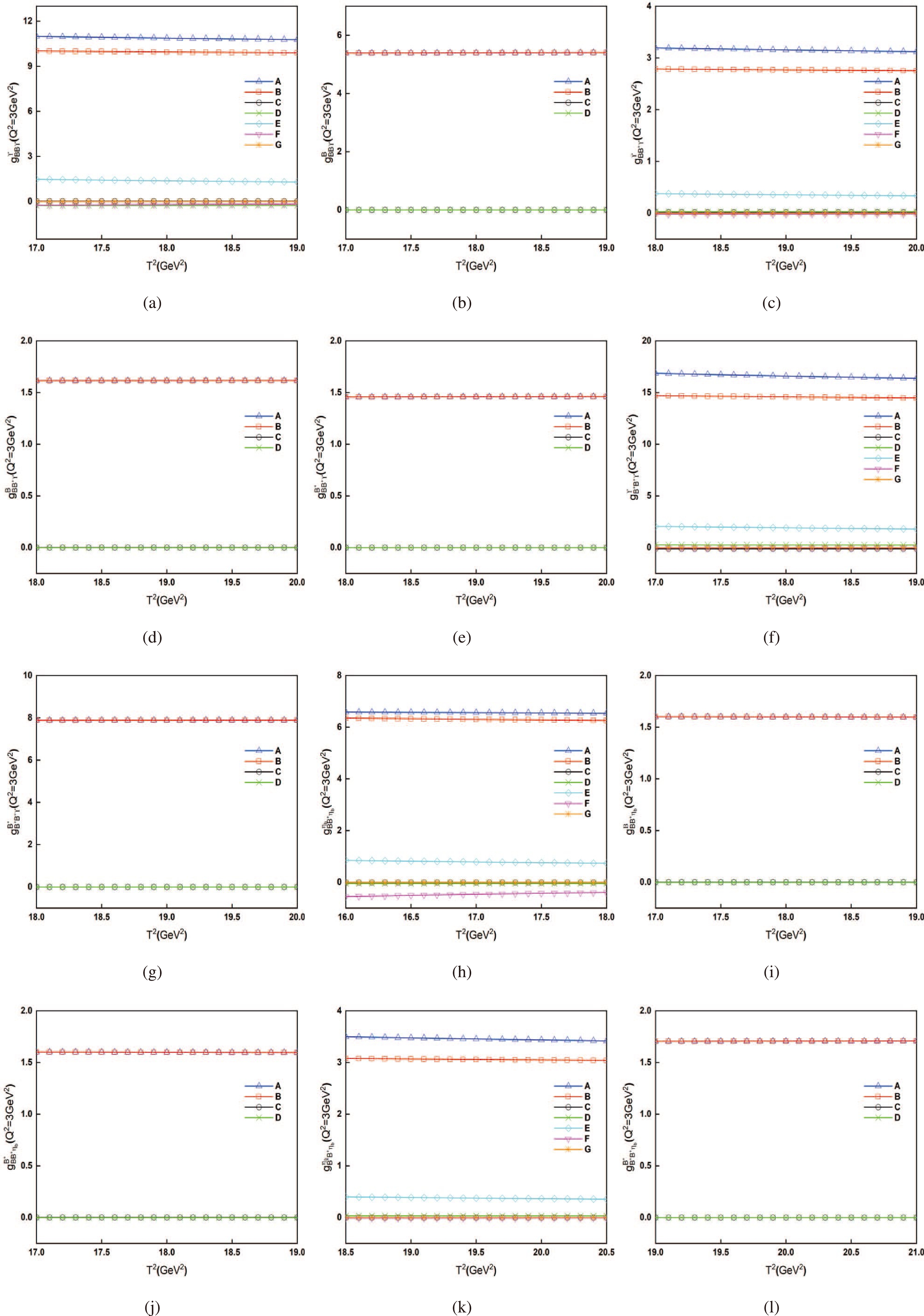 $ T^{2} $ for$ BB\Upsilon $ (a−b),$ BB^{*}\Upsilon $ (c−e),$ B^{*}B^{*}\Upsilon $ (f−g),$ BB^{*}\eta_{b} $ (h−j), and$ B^{*}B^{*}\eta_{b} $ (k−l), where A-G denote the total, perturbative,$ \langle g_{s}^{2}G^{2}\rangle, \langle f^{3}G^{3}\rangle,\langle\overline{q}q\rangle, \langle\overline{q}g_{s}\sigma G q\rangle $ , and$ \langle\overline{q}q\rangle\langle g_{s}^{2}G^{2}\rangle $ contributions.Considering different values of