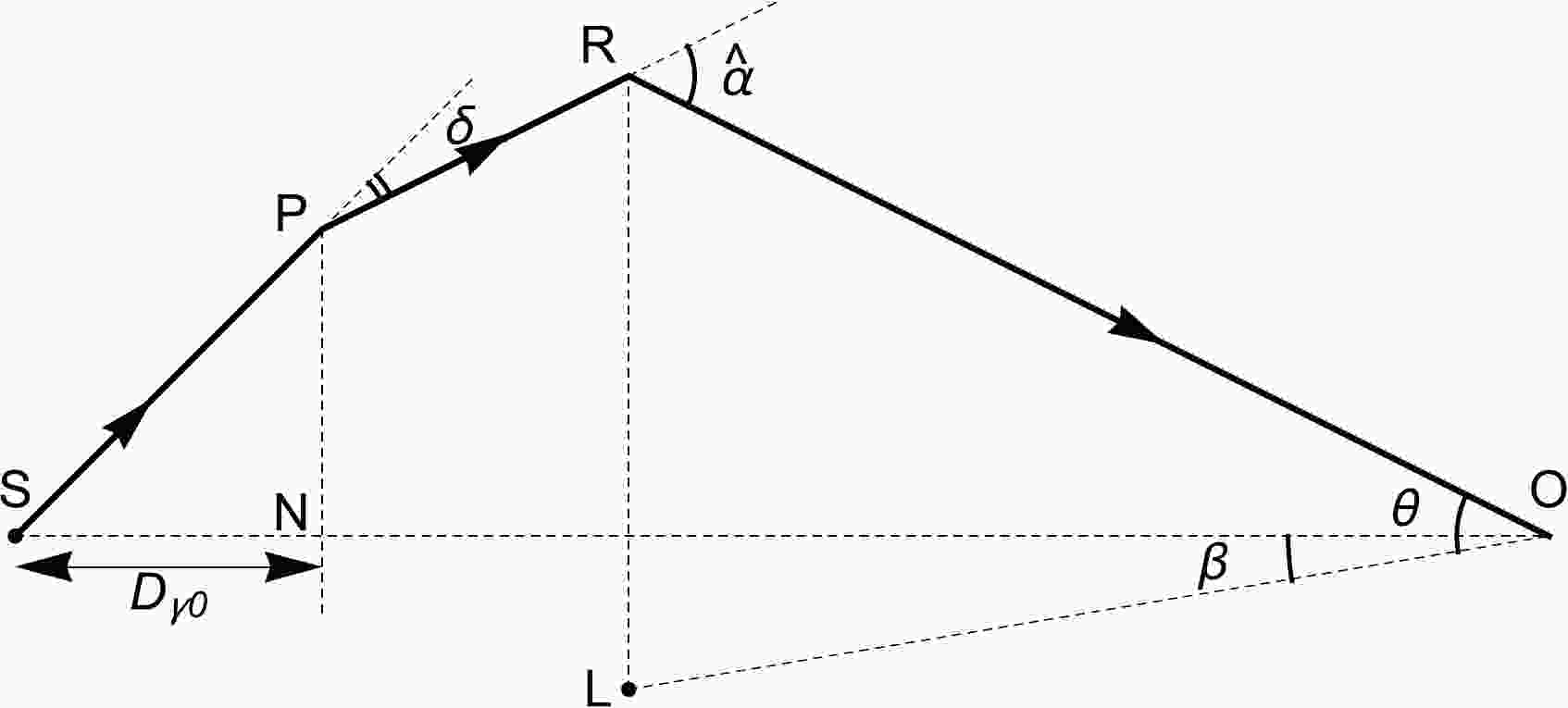 $ e^+e^- $ origin locations from the line of sight$S O$ . From the geometry of ray propagation, one has$ \begin{array}{*{20}{l}} L_\pm=D_{\gamma 0}(\hat\alpha+\beta-\theta_\pm+\delta). \end{array} $