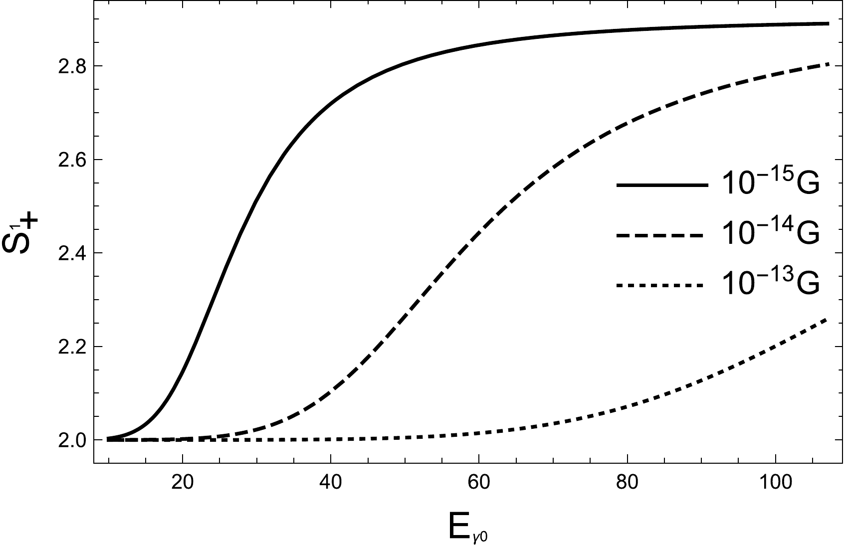 $ S_+^1 $ describing the transformation of the blazar spectrum. The energy of the primary photons$ E_{\gamma0} $ is given in TeV. The graph is given for the parameter values$ D_{OS}/D_{LS}=2 $ ,$ \beta/\theta_E=0.2 $ , and$ D_{OS}=1 $ Gpc and for three values of magnetic field B. -