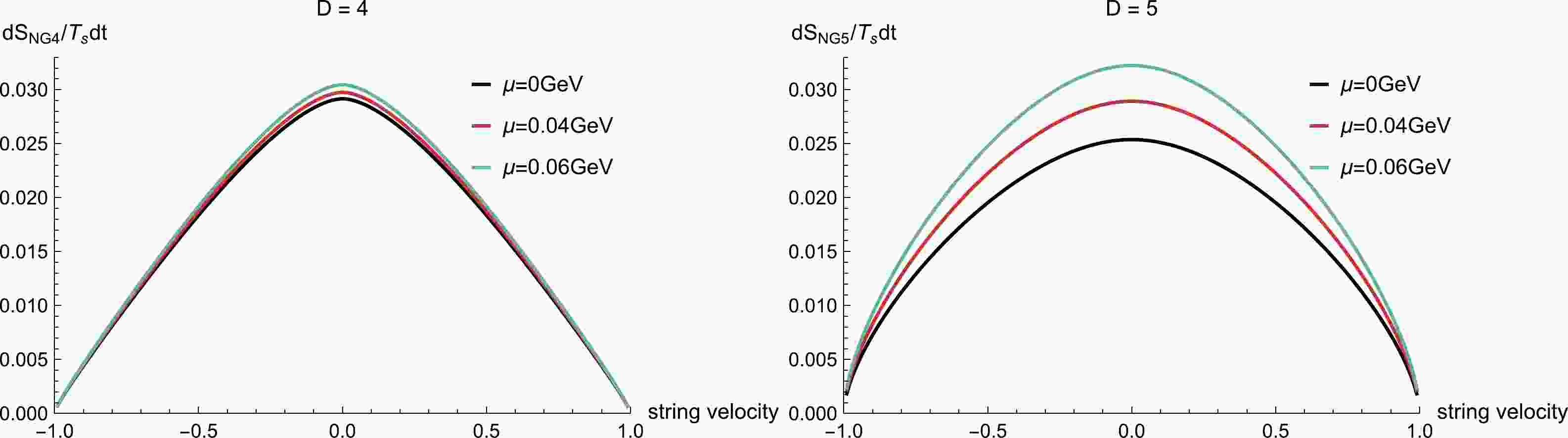 (13) We numerically solve the integral (13) and show how the string velocity, chemical potential, and temperature affect the NG action growth in D dimensions, as shown in the following figures.