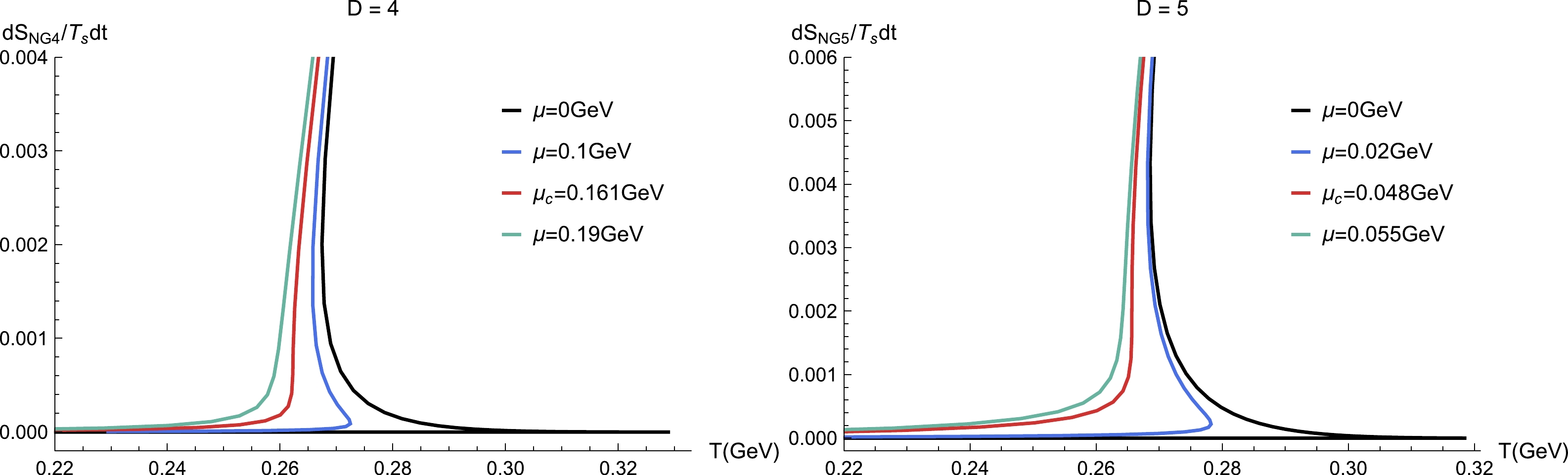 $ 0<\mu<\mu_c $ , indicating the presence of a first-order phase transition. However, for$ \mu \geq \mu_c $ , it is single-valued, reflecting a shift from phase transition to crossover. Our results indicate a decrease in the phase transition temperature corresponding to increased chemical potential, which agrees with the lattice QCD results [68]. In addition, we notice that the action growth values are enhanced by the chemical potential for the D = 4 and 5 cases. Moreover, Fig. 3 reveals a remarkable similarity between complexity and thermal entropy, as illustrated in Fig. 10 of [66], potentially attributable to complexity’s behavior, which is similar to entropy, in satisfying the second law of thermodynamics [69]. -