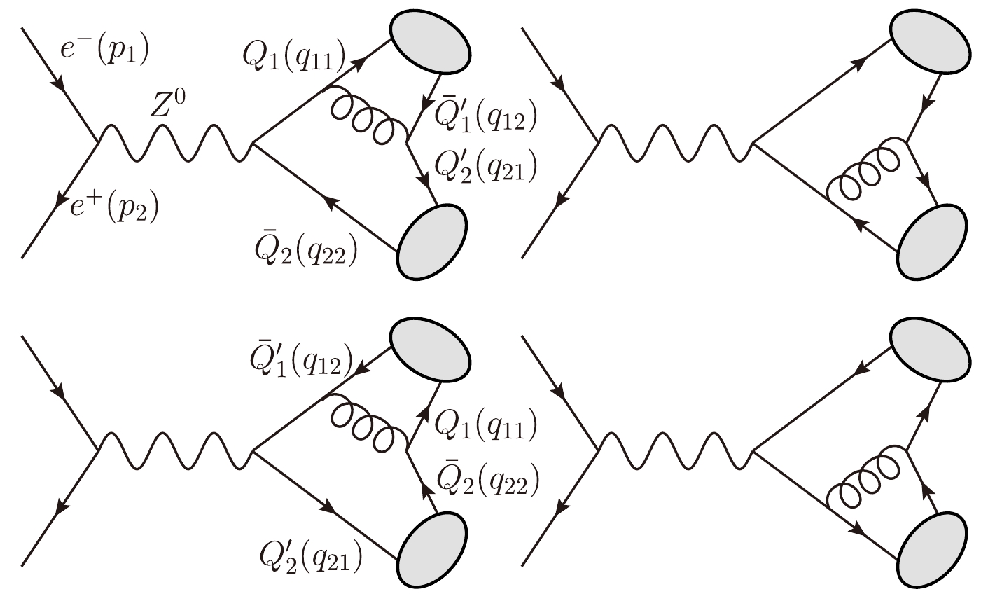 $ e^-(p_1) e^+(p_2) \to Z^0 \to |(Q\bar{Q}^\prime)[n]\rangle (q_1) + |(Q^\prime\bar{Q})[n^\prime]\rangle (q_2) $ are depicted in Fig. 1. According to the QCD factorization formula, its differential cross sections can be factored into the short-distance coefficients and the long-distance matrix elements