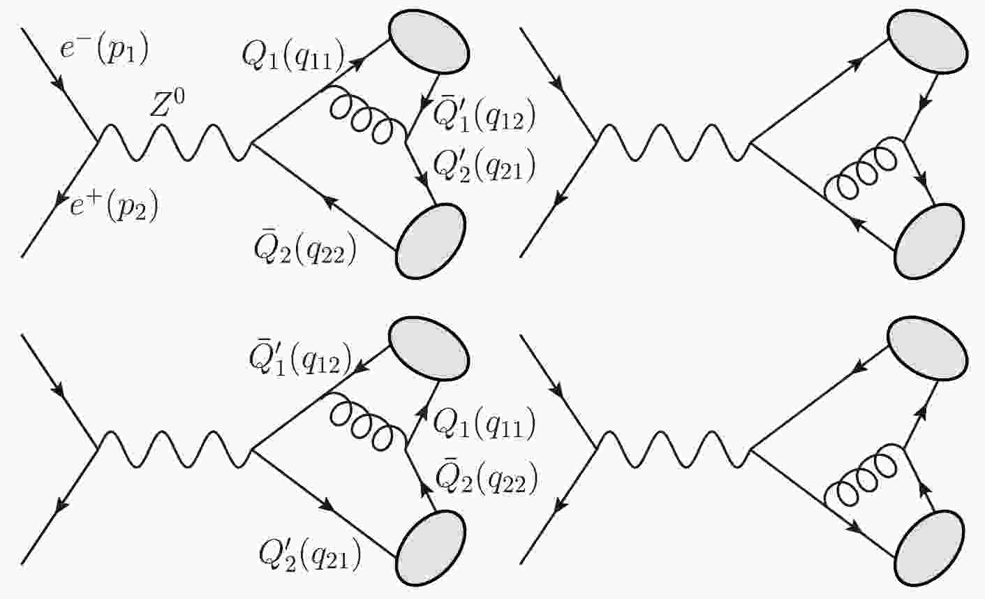 $ e^-e^+\to Z^0\to |(Q\bar{Q^\prime})[n]\rangle+|(Q^\prime\bar{Q})[n']\rangle $ ($ Q,\; Q^\prime=c $ - or b-quarks) at CM energy$ \sqrt{s}=91.1876 $ GeV are listed in Tables 2−4 for double charmonium, double bottomonium, and$ B_c $ pairs, respectively. The uncertainties are caused by the varying quark masses. The charm quark mass$ m_c $ has the variation$ \pm 0.1 $ GeV, and the bottom quark mass$ m_b $ has the variation$ \pm 0.2 $ GeV. In Tables 2−4, the top three rankings are marked in bold. For the double charmonium channels, we always have$ \sigma_{(|(c\bar{c})[n^3S_1]\rangle+|(c\bar{c})[n'^1P_1]\rangle)} > \sigma_{(|(c\bar{c})[n^1S_0]\rangle+|(c\bar{c})[n'^3P_2]\rangle)} > \sigma_{(|(c\bar{c})[n^1S_0]\rangle+|(c\bar{c})[n'^3P_0]\rangle)} $ at the same nth level. For double bottomonium channels, the largest cross sections can either be$ |(b\bar{b})[n^1S_0]\rangle+ |(b\bar{b})[n'^3S_1]\rangle $ or$ |(b\bar{b})[n^3S_1]\rangle+|(b\bar{b})[n'^3P_2]\rangle $ . For$ B_c $ pair channels, the largest cross section can either be$|(c\bar{b})[n^3S_1]\rangle + |(b\bar{c})[n'^3S_1]\rangle$ or$ |(c\bar{b})[n^3S_1]\rangle+|(b\bar{c})[n'^3P_2]\rangle $ . Note that in Tables 2−4, we have redundant data in the row of$ \sigma_{(|(Q\bar{Q}^\prime)[n^3S_1]\rangle+|(Q\bar{Q}^\prime)[n'^3S_1]\rangle)} $ , i.e., the cross sections are the same when n and$ n^\prime $ are exchanged. This is also a check for our extensive calculations.$ [n]+[n^\prime] $