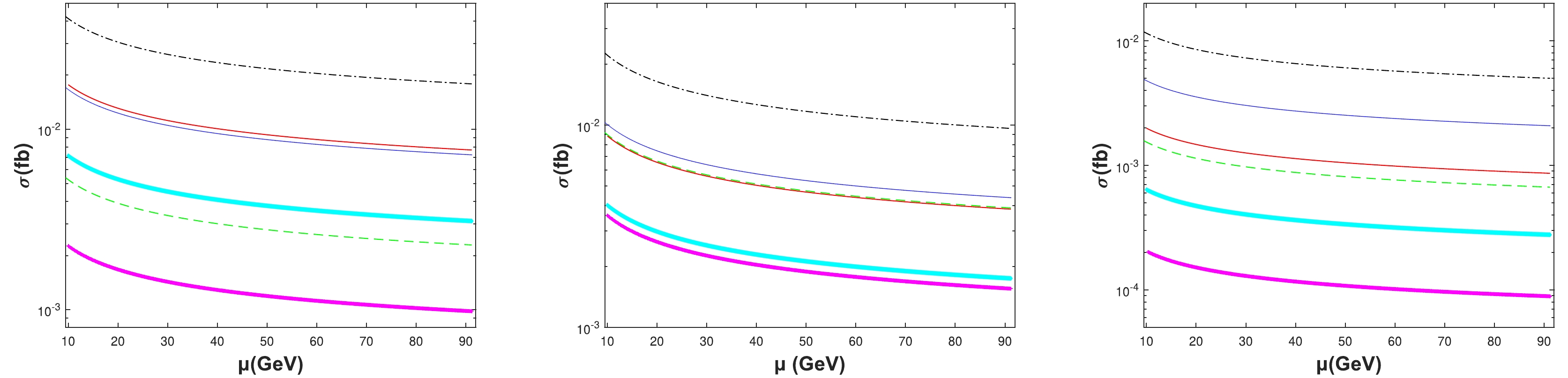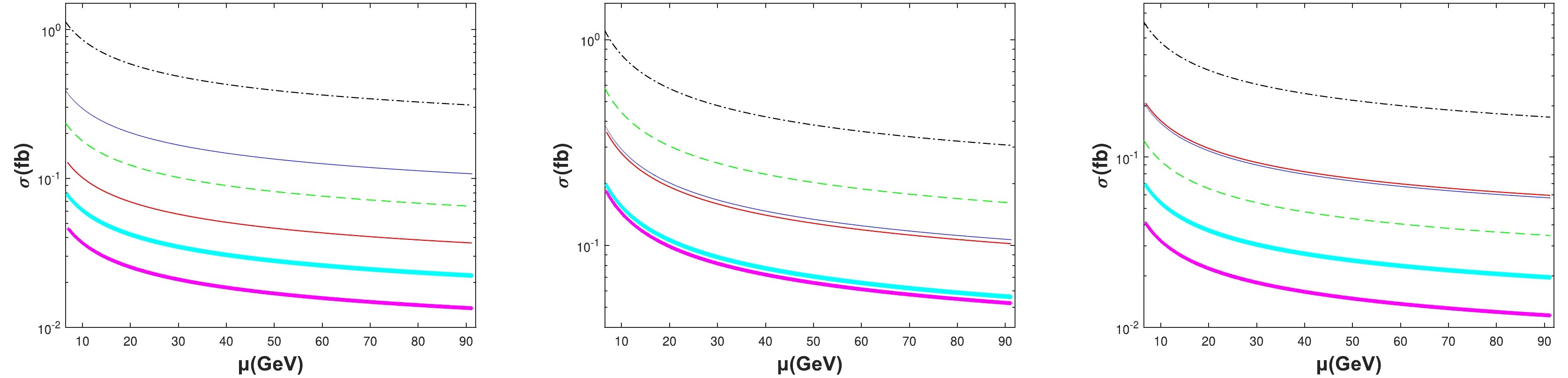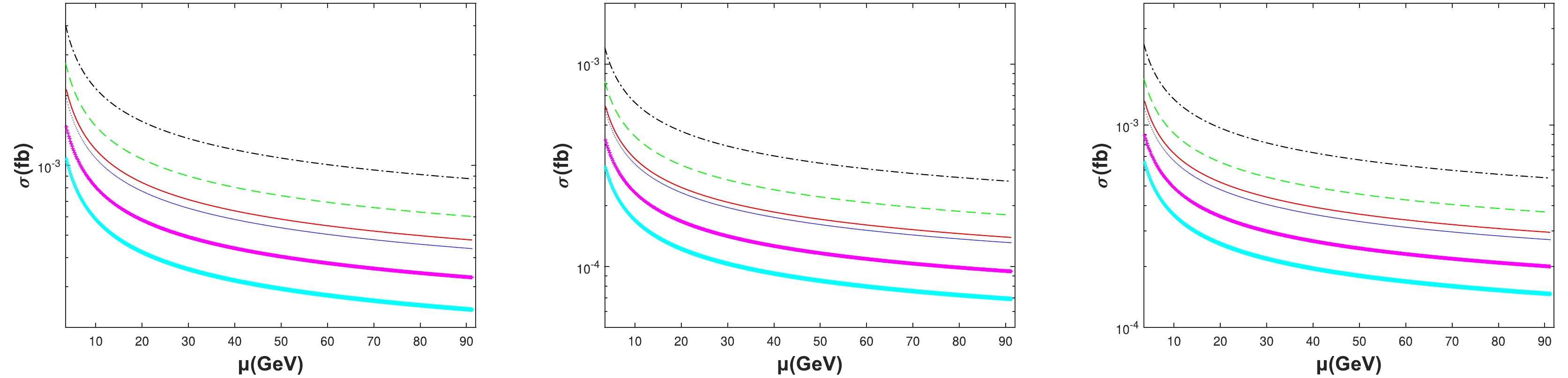 Figure 6. (color online) Total cross sections σ as a function of the renormalization scale μ at