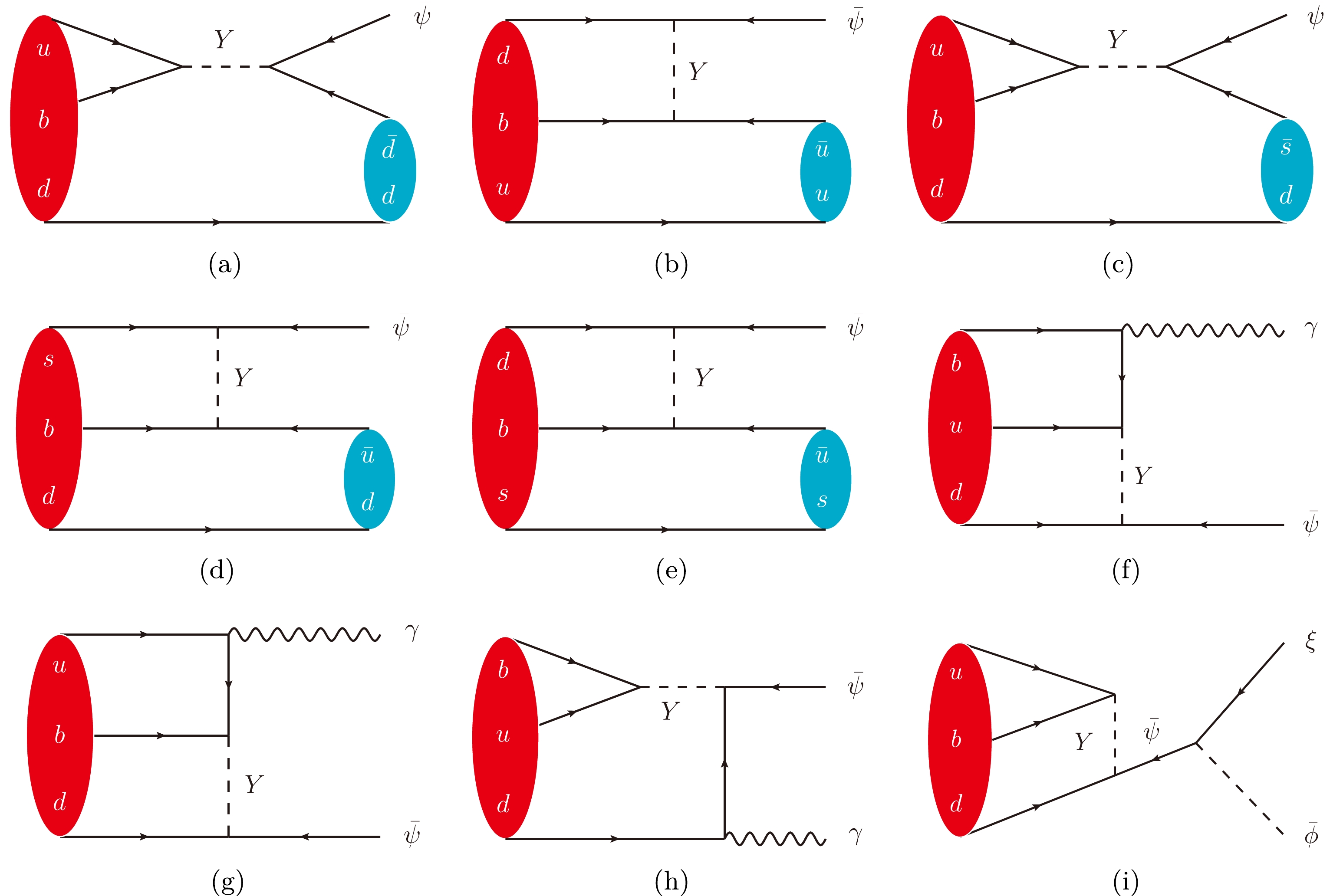 $ a,b,c $ ($ i,j,k $ ) denote the quark flavors (colors), L$ (R) $ represents the left-handed (right-handed) component of quarks,$ {\cal{C}} $ represents a charge conjugation, Y is a color-triplet scalar with electric charge$ Q_Y=-1/3 $ (which couples to ordinary quarks in the first two terms and to a right-handed quark and a dark fermion in the third term; it is a TeV-scale particle which will be integrated out in the bottom hadron decays), and ψ is a dark fermion with the baryon number$ B_\psi=-1 $ , which is a singlet under the standard model gauge group that can only couple to the right-handed down-type quarks under that color conservation. The total baryon number is conserved in the interaction of$ Y_i\bar\psi d_{R_c}^{i,{\cal{C}}} $ , while the visible baryon number is violated. This is illustrated in Fig. 1, in which ψ completely decays into stable dark matter, a dark scalar ϕ with$ B_{\phi}=-1 $ , and a dark Majorana fermion ξ. Their quantum numbers are summarized in Table 1.
