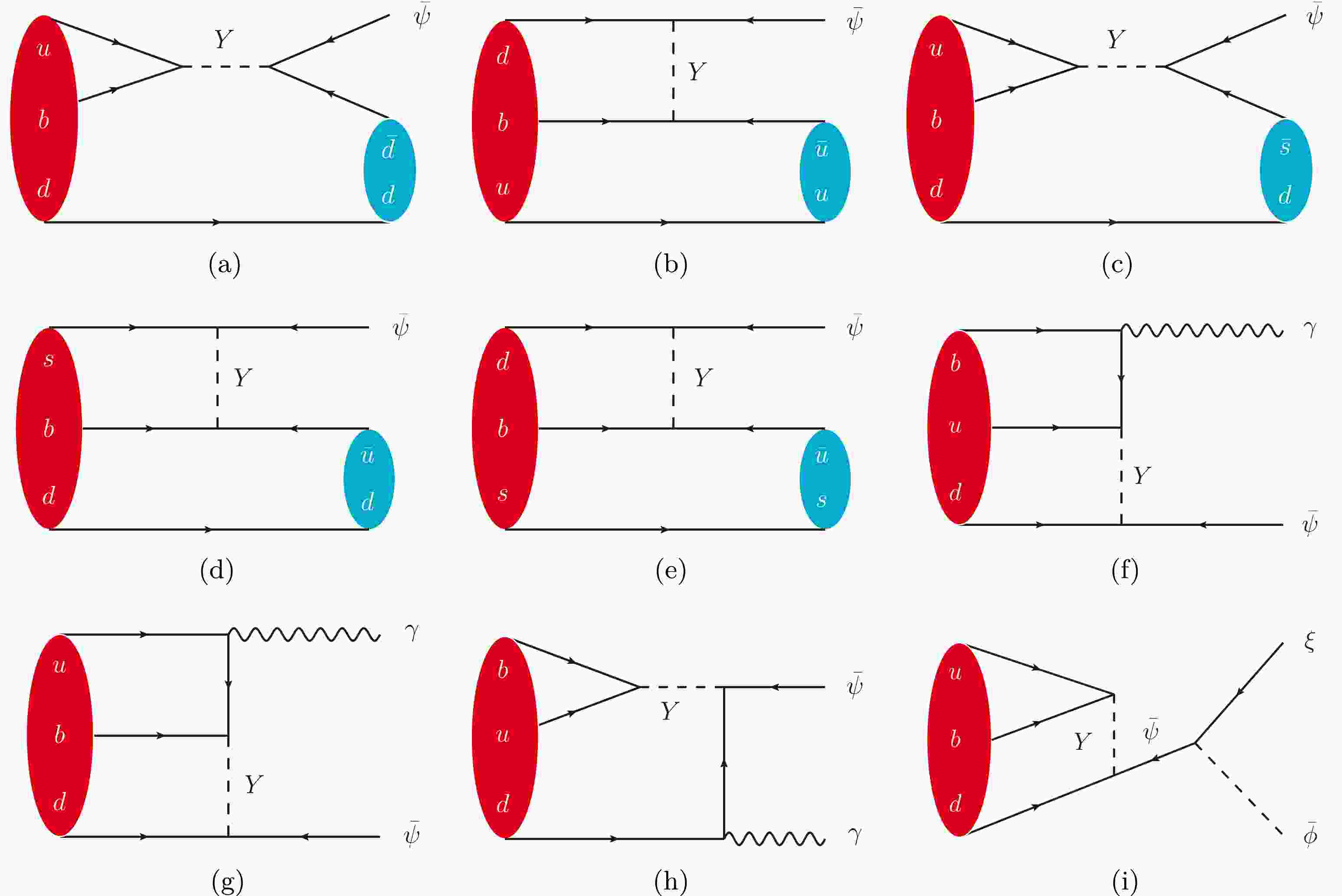 $ \Lambda_b^0\to \pi^0 \bar\psi $ , (c) for$ \Lambda_b^0\to K^0\bar\psi $ , (d) for$ \Xi_b^-\to \pi^-\bar\psi $ , (e) for$ \Xi_b^-\to K^-\bar\psi $ , (f,g,h) for the semi-invisible radiative decay of$ \Lambda_b^0\to \gamma\bar\psi $ , and (i) for the fully invisible decay of$ \Lambda_b^0\to \xi\bar\phi $ . The dark sector particles of$ \bar\psi $ and$ \bar \phi $ are charged under the baryon number of$ B_{\bar\psi, \bar\phi}=+1 $ , so that the total baryon number are conserved in these processes.Field S Q B Y 0 $ -\dfrac{1}{3} $