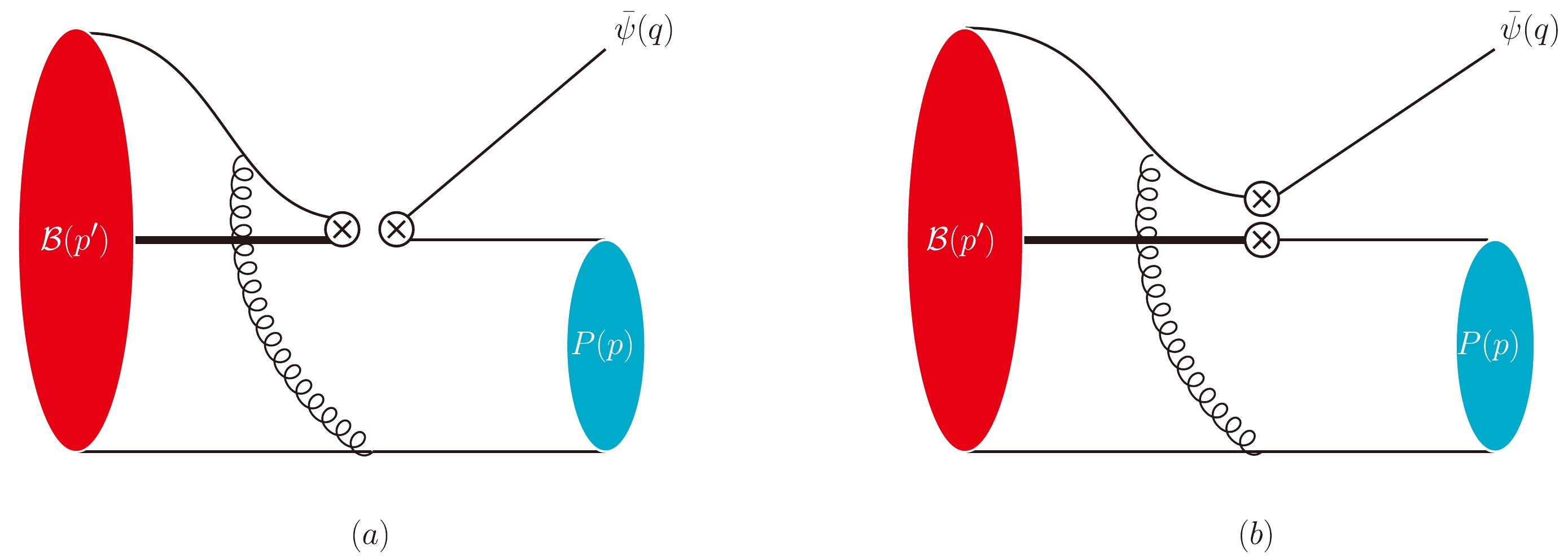 $ \Lambda_b^0/\Xi_b^- \to P\bar{\psi} $ decays, where the bold line represents the b quark and the circle cross denotes the currents in the$ {\cal{O}}^{L,R} $ operators.$ {\rm i} {\cal{M}} = C^{L,R}_{u_ad_b,d_c} \bigg( \bar{v}_{\psi}^{{\cal{C}}}(q) \langle P(p)| {\cal{O}}^{'L,R}_{u_ad_b,d_c} |{\cal{B}}(p')\rangle \bigg), $