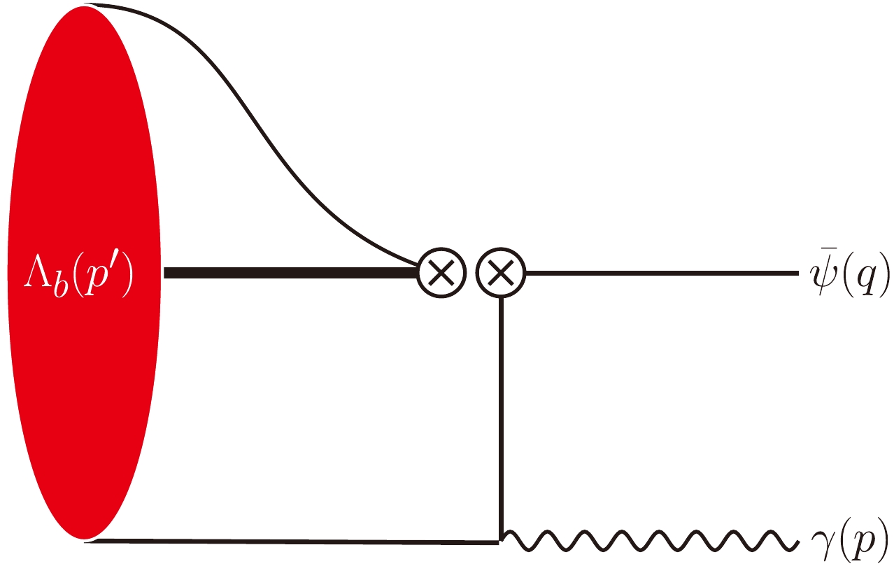 $ \Lambda_b^0 \to \gamma\bar{\psi} $ with the bold line representing the b quark.$ {\rm i} {\cal{M}} = C^{L,R}_{u_ad_b,d_c} \bigg( \bar{v}_{\psi}^{{\cal{C}}}(q) \langle \gamma(p)| {\cal{O}}^{'L,R}_{u_ad_b,d_c} |\Lambda_{b}^0(p')\rangle \bigg). $
