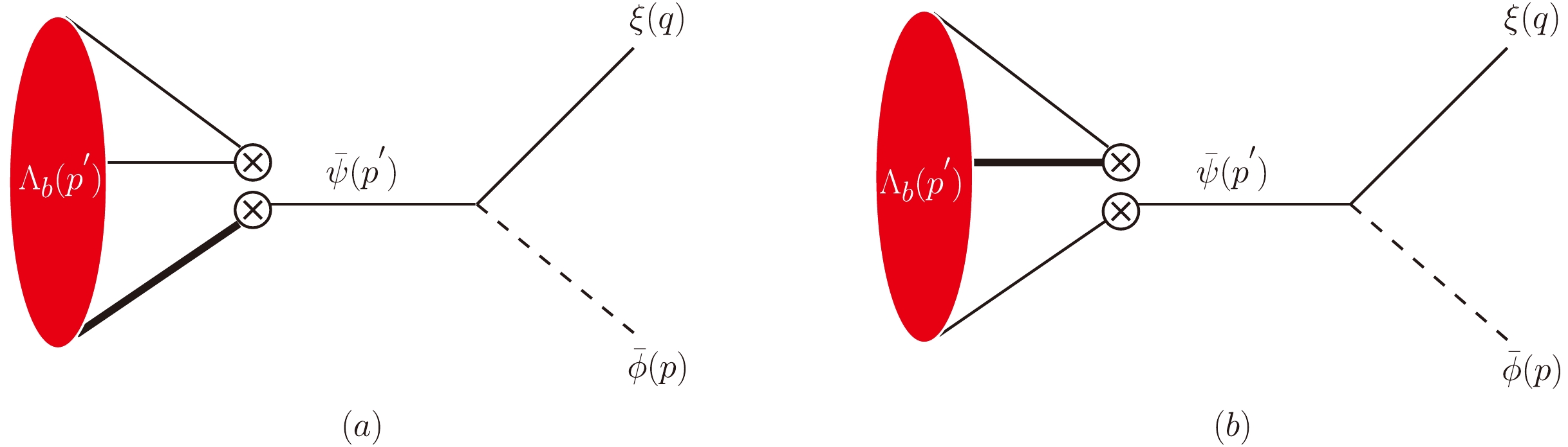 $ \Lambda_b^0 \to \xi\bar{\phi} $ process, with the bold line denoting the b quark.$ \begin{aligned}[b] {\rm i} {\cal{M}}_{ud,b}^{L,R} &= y_dC^{L,R}_{ud,b} \bigg(\bar{u}_{\xi}^{{\cal{C}}}(q) \frac{\not {p}'+m_{\psi}}{p'^{2}-m_{\psi}^2} \langle 0| {\cal{O}}^{'L,R}_{ud,b} |\Lambda_b^0(p') \rangle \bigg), \\ {\rm i} {\cal{M}}_{ub,d}^{L,R} &= y_dC^{L,R}_{ub,d} \bigg(\bar{u}_{\xi}^{{\cal{C}}}(q) \frac{\not {p}'+m_{\psi}}{p'^{2}-m_{\psi}^2} \langle 0| {\cal{O}}^{'L,R}_{ub,d} |\Lambda_b^0(p')\rangle \bigg), \end{aligned} $