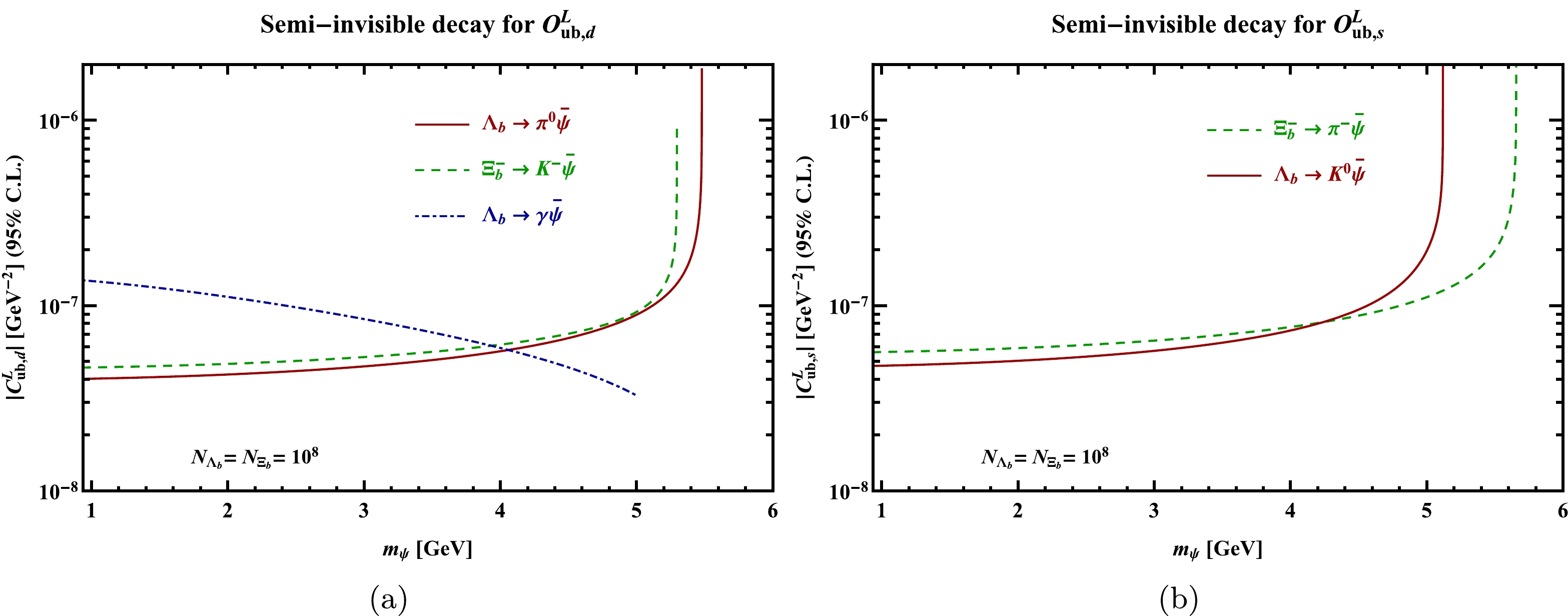 $ m_\psi $ in the semi-invisible decays of bottom baryons. The left panel illustrates the constraints on$ |C^L_{ub,d}| $ , while the right panel display the constraints on$ |C^L_{ub,s}| $ . The declines of the constraints at the tail result from the suppression of phase space. When dark fermion mass$ m_\psi $ close to the mass of$ \Lambda_b^0 $ baryon, the soft photon radiation in$ \Lambda_b^0\to\gamma\bar{\psi} $ channel will induce a serious infrared divergence, which invalid the leading order estimation in this region. Hence, we omit the constraints in$ \Lambda_b^0\to\gamma\bar{\psi} $ process when$ m_\psi>5 $ GeV (blue dot dashed line).For the