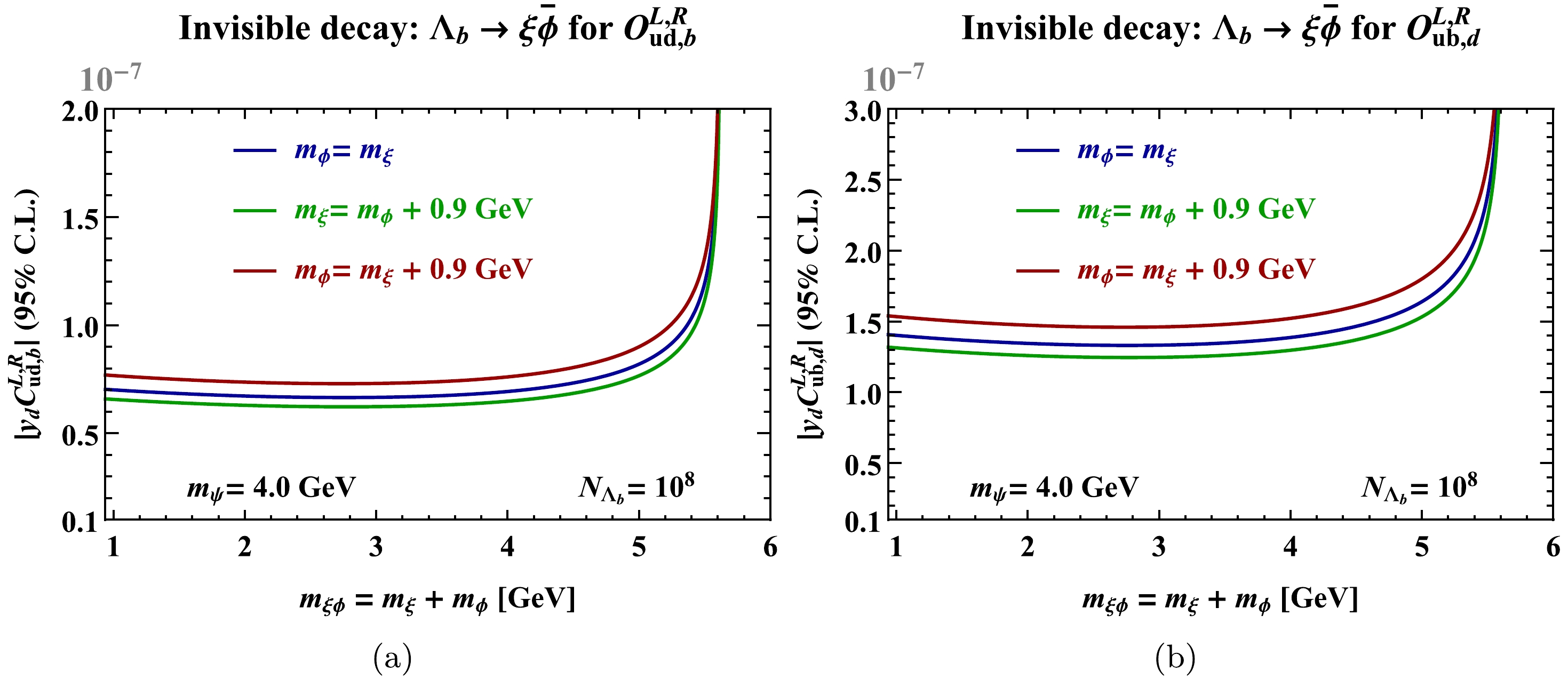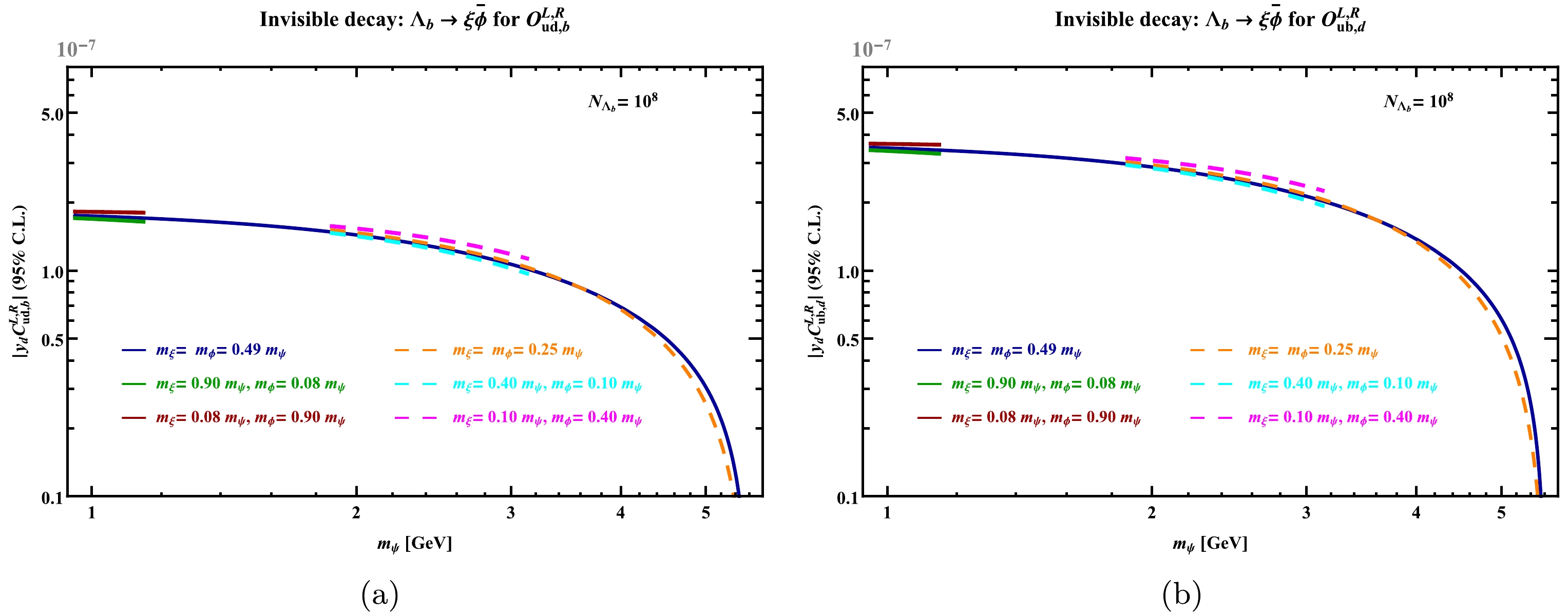 $ m_{\psi} $ are given for$ |y_d\; C_{ud,b}^{L,R}| $ in the left panel, and for$ |y_d\; C_{ub,d}^{L,R}| $ in the right panel. We estimate the constraints in six different mass distributions of dark matter particles. Three cases of the masses of ξ and ϕ are shown as the blue, green, and red curves, with (i)$ m_{\xi}=m_{\phi}=0.49 \,m_{\psi} $ , (ii)$m_\xi= 0.90\,m_\psi$ ,$ m_\phi=0.08\,m_\psi $ , and (iii)$ m_\xi=0.08\,m_\psi $ ,$m_\phi= 0.90\,m_\psi$ , respectively. Because the stable dark particles ξ and$ \bar{\phi} $ carry most of the mass of$ \bar{\psi} $ , the decay of protons into$ \xi\bar{\phi} $ through off-shell$ \bar{\psi} $ particles is forbidden for$ m_\psi\simeq 1 $ GeV. In addition, to directly illustrate the dependence of the constraints on the mass distribution of dark particles, three other cases of$ m_\xi $ and$ m_\phi $ are shown as the orange, cyan, and magenta curves, with (i)$m_\xi=m_\phi = 0.25\,m_\psi$ , (ii)$ m_\xi=0.4\,m_\psi,\; m_\phi=0.1\,m_\psi $ , and (iii)$ m_\xi=0.1\,m_\psi, m_{\phi}=0.4\,m_\psi $ , respectively. For these cases, a truncation at the small-mass region was imposed to prevent the decay of protons into$ \xi\bar{\phi} $ . Because the DM stability in Eq. (49) prohibits a large mass difference between dark fermions ξ and dark scalar baryons ϕ, it also imposes a truncation at the large-mass region with a specific mass distribution. We found that the constraints on the parameters of B-Mesogenesis can reach$ {\cal{O}}(10^{-7}) $ GeV-2. Because the values of the form factors from the left- and right-handed operators are the same except for their signs, the constraints on the operators with different chirality are equal to each other. For the operators with different flavor structures, a factor of$ 2 $ in the constraint on$ |y_d\; C^{L,R}_{ub,d}| $ arises from the half suppression of the decay constants$ \lambda^{L,R}_{ub,d} $ in the comparison between Eqs. (43) and (44). In the allowed mass region, we found that the differences between the constraints for various mass distributions are very small, indicating that the fully invisible decay of$ \Lambda_b $ baryons is insensitive to the mass distribution of dark particles. The drop in the constraints at$ m_\psi $ values close to$ m_{\Lambda_b} $ arises from a nearly on-shell transition of$ \Lambda_b^0\to\bar{\psi} $ , which significantly enlarges the invisible decay rate.Similarly, the constraints on the parameters of the mass of