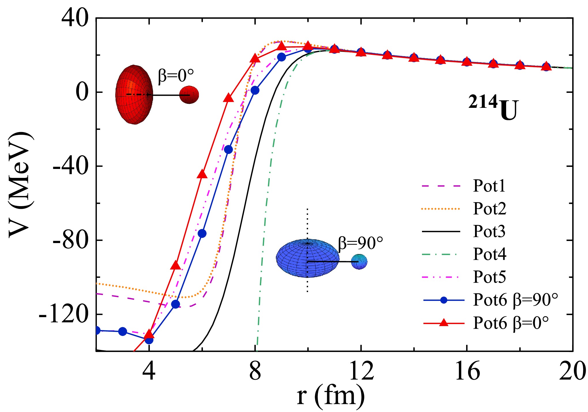 • The six potential barriers for the α-decay of $ {\rm^{214}U} $ are shown in Fig. 1. The potentials for two different orientations β=0° and 90° in Pot6 are shown as red solid lines with triangles and blue solid lines with circles, respectively. These potentials are significantly different, which can lead to a large difference in the penetration probability P of the α-particle through each potential because P depends strongly on the height and width of the potential barrier. Consequently, the α-decay reduced width $ \delta^{2} $ can be considerably different correspondingly.