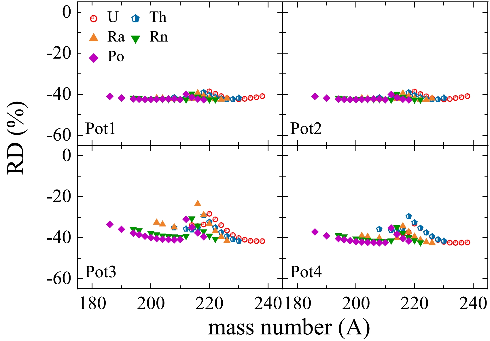 • The WKB approximation is more reliable with a gentle variation in potential, i.e., only slightly change over the de Broglie wavelength. Its computational accuracy in studies on heavy-ion fusion, alpha decay, and proton and cluster radioactivity has been discussed [13, 33, 34]. Ref. [13], for Pot3, found that P of the α-decay obtained using the WKB approximation is about 30%−40% smaller than the exact one obtained with the TM approach. In this work, the accuracy of the WKB approximation to calculate P is examined using different α-core potentials. The relative deviation of the WKB approximation can be examined using $RD=(P_{\mathrm{WKB}}-P_{\rm TM})/ P_{\rm TM}\times$100%. $P_{\rm WKB}$ and $P_{\rm TM}$ denote the penetration probabilities obtained using the WKB approximation and TM approach, respectively. In this work, the α-decay of nuclei around $ {\rm^{214}U} $ is considered. The experimental $ Q_{\alpha} $ values are obtained from Refs. [14, 35]. The RD values obtained with different α-core potentials are plotted as a function the mass number of parent nuclei in Fig. 2. For Pot1 and Pot2, the RD values are almost constant (about –40%), whereas for Pot3 and Pot4, the RD values vary from about –20% to –40%. This is because both Pot3 and Pot4 are dependent on the mass number, whereas Pot1 and Pot2 are not.