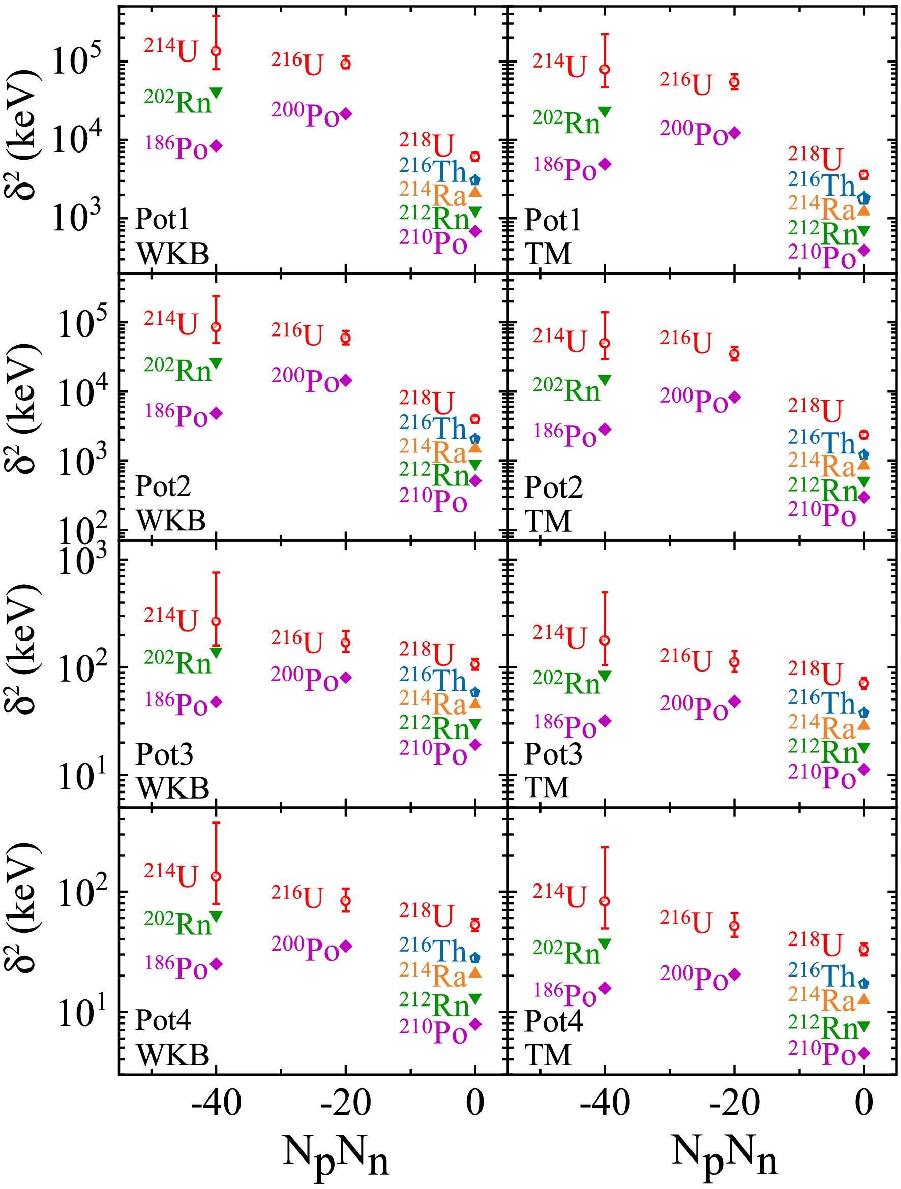 Using the WKB approximation and TM approach, we extract$ \delta^{2} $ of the ground state to ground state decays of $ {\rm^{214}U} $ and the surrounding nuclei for Pot1-Pot4, which is shown in Fig. 3 as function of $ N_{p}N_{n} $. Here, $ N_{p} $ and $ N_{n} $ are the proton and neutron numbers relative to the nearest closed shell Z = 82 and N = 126, respectively. In this work, the error in $ \delta^{2} $ is caused only by the uncertainty of the experimental half-life [14]. Figure 3 clearly shows that$ \delta^{2} $ is model-dependent. Nevertheless, as discussed in Ref. [36], rich information about the structural properties of nuclei can be gained from the trend in $ \delta^{2} $ of different isotopes, rather than from $ \delta^{2} $ itself. Comparing the results in the left column of Fig. 3, we observe that the values of $ \delta^2 $ for different α-core potentials vary by almost three orders of magnitude, from $ 10^{2} $ to $ 10^{5} $. According to Eq. (1), for the same nucleus, the only factor that affects the value of the $ \delta^2 $ is P. In Fig. 1, Pot1 has the largest barrier width, resulting in a lower probability of the α-particle crossing this barrier. Therefore, the value of $ \delta^2 $ obtained with Pot1 is the largest. If we compare the results in the left and right panels, for the same α-core potential, we find that the values of $ \delta^2 $ obtained with the TM approach are smaller than those obtained with the WKB approximation. This is owing to the underestimation of P in the WKB approximation. In addition, in all cases, the $ \delta^2 $ of $ {\rm^{214,216}U} $ is larger than those of surrounding nuclei. This is consistent with the results presented in the experimental paper Ref. [14] in which Pot4 and the WKB approximation were used.